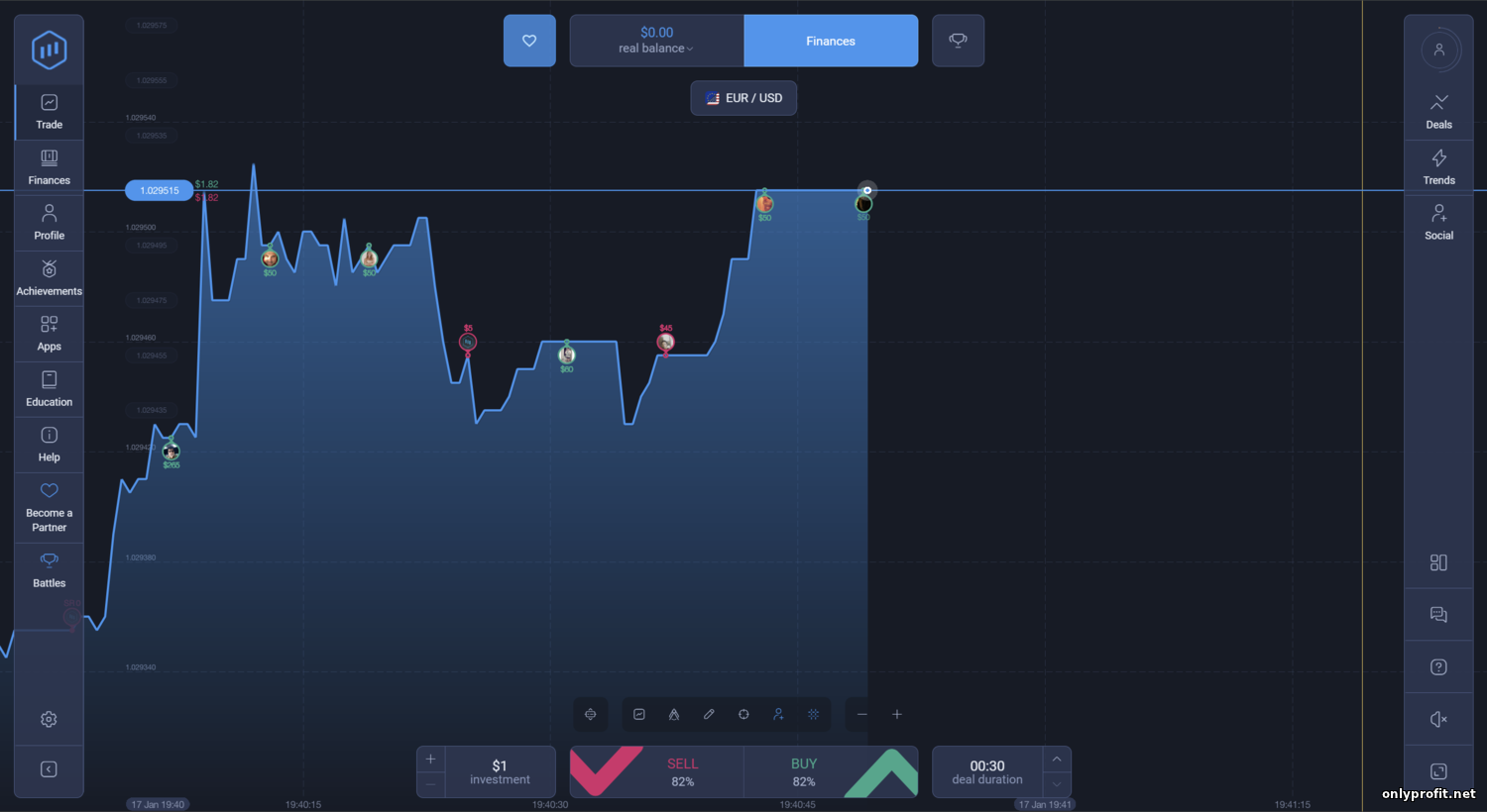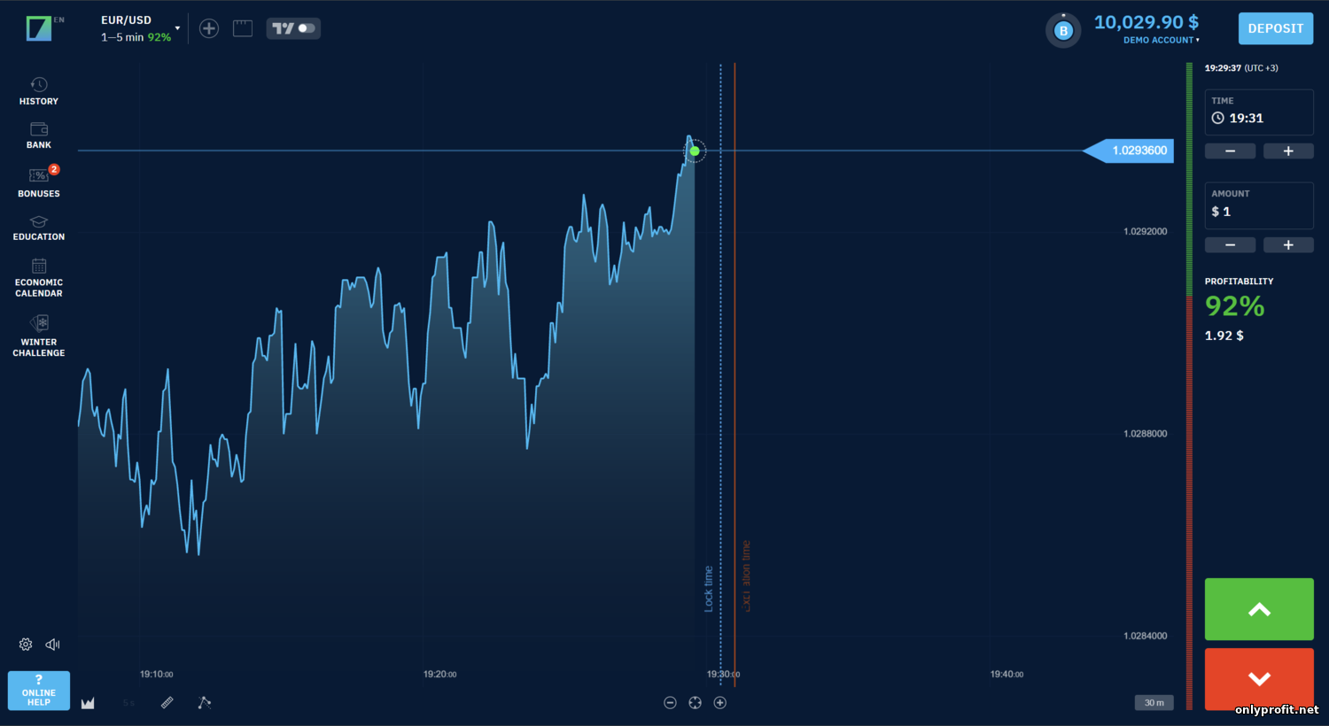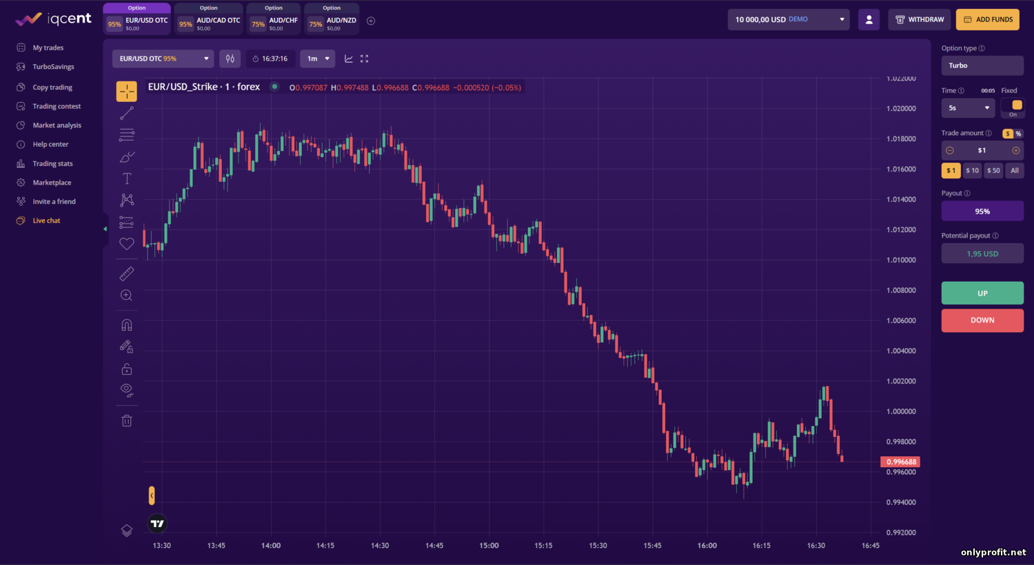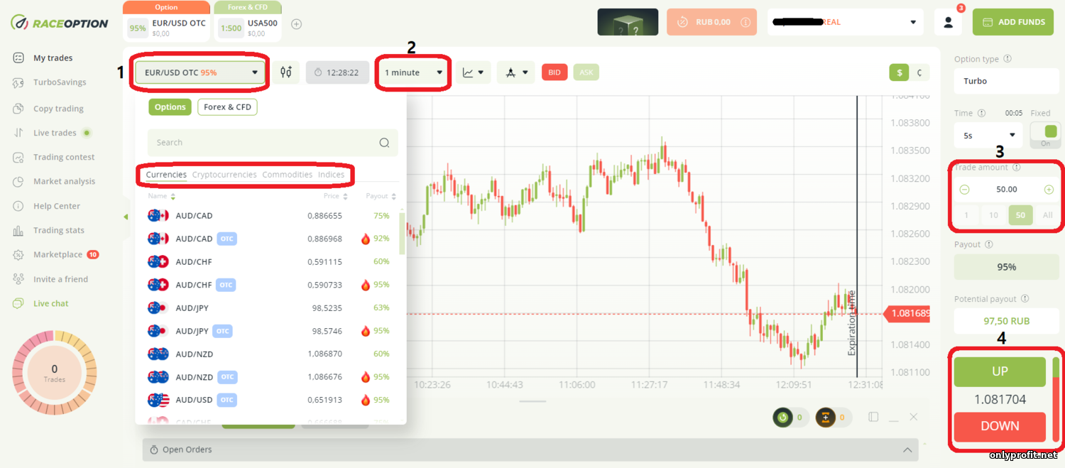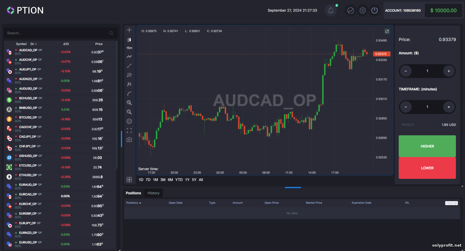 - Минимальный депозит и минимальная ставка? — Для открытия счёта достаточно внести $10, а минимальная сумма сделки составляет $1. Эти параметры стандартны и позволяют начать торговлю с небольшим капиталом. Валютой счёта может быть доллар или евро – в зависимости от выбора при регистрации.